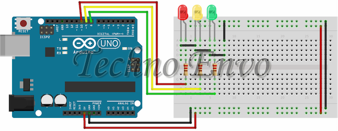 A simple traffic light model is a great way to learn about controlling multiple LEDs with Arduino. This project simulates a traffic light sequence with red, yellow, and green LEDs.